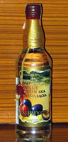 In Poland it is a renowned brand and it also gained much recognition abroad.[1] However, as producing alcohol outside of established industrial distilleries is illegal in Poland, so is the Śliwowica łącka.[1] Numerous social organisations have been campaigning to have this law changed, so far unsuccessfully.[1] A "Fruit-harvesting Festival" celebrating the Śliwowica is held yearly in Łącko.[1]