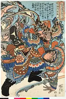 | 5 | 5 | Tianyong (天勇); Brave Star (天勇星) | Guan Sheng (关胜; 關勝; Guān Shèng; Kuan Sheng) | "Great Blade" (大刀) | Five Tiger Generals (cavalry) | Left General | Imperial general | Yuncheng, Shanxi | 63 | Blue Dragon Crescent Moon Blade (青龍偃月刀) | ![]() | Dies of illness | ||
