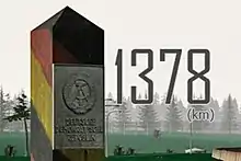 1378 (km) is a first-person shooter multiplayer video game developed by Jens M. Stober, a student at the Karlsruhe University of Arts and Design. In his game, Stober had reused some code and gameplay principles of "Frontiers", a game by the artist group gold extra, on which he had also worked as a map designer.[1] The title refers to the length in kilometres of the Inner German border between East and West Germany from 1949 to 1990, then known as the "death strip".[2] It allows players, up to 16 people at the same time, to take the role of either East Germans trying to cross the border or East German border guards shooting anyone attempting to do so.[2][3] The game was scheduled to be officially released on October 3 (the anniversary of German reunification) 2010, but was delayed due to its controversy.[3] The game was released in December 2010 following "a public discussion with distinguished guests" at the Karlsruhe University, and will have an age rating of 18+.[4][1][5] The director of the Berlin Wall Foundation, Axel Klausmeier, denounced the game as "tasteless" as well as "a slap in the face of victims' families", and claimed that there was nothing to be learned from the game.[3] On the other hand, Adam Rafinski, a lecturer at the Karlsruhe University who supported the game concept, claimed that it is a serious game not to play just as a pastime and players can take a history lesson from it.[3]