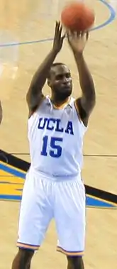 Before the season's opening game, freshman Shabazz Muhammad was declared ineligible to participate by the NCAA.[4] He was ruled to have received improper benefits for travel expenses and lodging during unofficial visits to Duke and North Carolina. After missing three games and an appeal by UCLA, he was reinstated, and his family was required to repay approximately $1,600.[5] He scored 15 points off the bench in his debut in a 78–70 loss to Georgetown in the semifinals of the Legends Classic. Jordan Adams added 22 points in the game, extending his school record to four games of 20-point games by a freshman to start a season.[6][7] Muhammad became a starter in the next game against Georgia, and he scored a game-high 21 points in a 60–56 win in the Classic's consolation game.[7] The following game, UCLA led Cal Poly by 18 points with 12 minutes remaining before they were upset, 70–68. Earlier in the year, the Bruins needed overtime to defeat another Big West team, UC Irvine.[8] UCLA dropped out of the AP Poll after being ranked No. 11.[9] UCLA lost 78–69 in the John R. Wooden Classic to the San Diego State Aztecs, the Bruins' first ranked opponent of the year. Although it was a neutral-site game in nearby Anaheim, the crowd favored the Aztecs.[10]