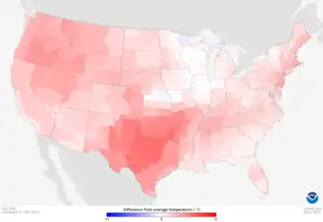 Temperatures in Abilene, Texas on July 20 hit 110 °F (43 °C), breaking a daily record. Austin, Texas also saw a daily high record of 104 °F (40 °C). Daily record high low temperature records were set, like in Needles, California, where the temperature never dipped below 95 °F (35 °C) on July 20. Record warm low temperatures were also set in Galveston (86 °F (30 °C)), Wichita Falls (84 °F (29 °C)), Houston (81 °F (27 °C)) and Laredo (81 °F (27 °C)), on July 20.[29] The heat wave was responsible for 18 other deaths, including 12 in Maricopa County, Arizona and one at Badlands National Park.[30] Witchita Falls hit 115 °F (46 °C) on July 20, a record for July, while on that day Oklahoma also reached that mark. Oklahoma City set a monthly record high of 110 °F (43 °C).[31] Further east, every day from July 20 to 24 in Newark, New Jersey got at or over 100 °F (38 °C), the longest streak on record. Boston also set a record high on July 24, at 100 °F (38 °C).[32] When the heat wave broke on July 25, multiple flash flood warnings were issued with the cold front.[33] While most parts of New Jersey exceeded 90 °F (32 °C) for the 8th day, New York City was kept to 86 °F (30 °C), thus keeping the heat wave to 6 days there.[34] Also, in New York City, for only the 3rd time, the entire month had highs above 80 °F (27 °C).[35] Overall, July 2022 was the 3rd warmest July on record, 8th for daily maximum but had the warmest daily minimums at record, at 63.57 °F (17.54 °C). Texas saw their warmest July on record, with an average high temperature of 100.2 °F (37.9 °C).[36]
