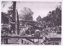 When used as a rolling mount, an extension of the carriage was fitted over the rear trucks to allow the ammunition car behind the mount to place ammunition on the shot truck which was then manually run up to the breech for loading. In an emplacement this extension was removed and ammunition hoisted up through a hatch on the floor of the mount, between the shot truck rails, from an ammunition car on the outer track and then lowered onto the shot truck. An estimated twelve men were required to ram the shell.[7] It used the German naval system of ammunition where the base charge was held in a metallic cartridge case and supplemented by another charge in a silk bag which was rammed first. The existence of a shell with 55 kilometres (60,000 yd) range must be regarded as unconfirmed, the longest engagement recorded for any of these guns was 44 kilometres (48,000 yd) during the bombardment of Dunkerque by Batterie Pommern in Flanders in 1917—8.[8]