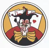 1. Approved 10 May 1943.Description: On a disc per fess debased arched, orange and red, within a border black, piped white, four playing cards (aces) arranged spades, diamonds, clubs, and hearts, reading from dexter to sinister, issuing from arched segment in base, all behind a knave with evil facial expression, wearing black suit, orange collar, black hat of three points, trimmed and balled in each point of red.