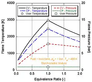 Assuming initial atmospheric conditions (1 bar and 20 °C), the following table[1] lists the flame temperature for various fuels under constant pressure conditions. The temperatures mentioned here are for a stoichiometric fuel-oxidizer mixture (i.e. equivalence ratio φ = 1).