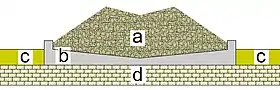 A section through Zibold's dew condenser. (a) is a truncated cone of beach pebbles 20 metres (66 ft) in diameter at the base and 8 metres (26 ft) in diameter at the top. (b) is a concrete bowl; a pipe (not shown) leads away from the base of the bowl to a collecting point. (c) is ground level and (d) is the natural limestone base.[11]