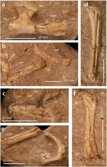 | A, humerus of holotype; B, radius and ulna of holotype; C, sternum of holotype; D, referred metacarpal IV; E, metacarpal IV and scapulocoracoid of holotype; F, femur of holotype. | |