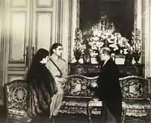 After the Russian Revolution and World War I many Persians from the Caucasus tried to escape from the Red Army to Iran. With his family ties in Azerbaijan and Iran, Ali Akbar Bahman was able to help refugees cross the border. On 26 August 1919 Ali Akbar was appointed Envoy Extraordinary and Minister Plenipotentiary of Persia to Bucharest, and then in 1921 ambassador to Belgium. From 1934 to 1935 he was Iran's Ambassador to Afghanistan, and in 1935 arranged the "Atabay Arbitration" (territorial exchanges between both countries in the Sistan-Zabulistan region).[6] In 1935 he also became Minister of Transport and with seven other members of the cabinet responsible for the 1935 commemoration stamp set.[7] Finally 1939-1943 he became ambassador to Egypt. There he arranged the marriage of Mohammad Reza Pahlavi (in those days Crown Prince of Iran) with Princess Fawzia, daughter of King Fouad I and sister of King Farouk of Egypt on 16 March 1939 in the Abdeen Palace at Cairo.[8][9]