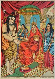 Shiva went to Kashi to beg for food. To his surprise, the kitchen was owned by his wife Parvati, but in the form of Annapurna. She wore celestial purple and brown garments, which were lightly adorned with ornaments. She was seated on a throne, serving and distributed food to the starving gods and hungry inhabitants of the earth. Annapurna offered her food as alms to Shiva and made him realize that as Brahman, Shiva might have outgrown hunger; but his followers had not.[6]