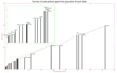 There was controversy over the fact that the population figures are based on residents, not citizens, resulting in countries with larger disenfranchised immigrant populations gaining more under Lisbon than those with smaller ones.[13] Italy would have been the greatest loser under the Lisbon system and sought the same number of MEPs as France and the United Kingdom. Italy raised the issue during treaty negotiations and succeeded in gaining one extra MEP (giving it the same as the UK) while the President of the European Parliament would not be counted as a lawmaker hence keeping the number of MEPs to the 750-seat limit.[14] MEPs also intended to propose amendments well in advance of the 2014 elections to take account of demographic changes. It was hoped that this would avoid the political horse trading that occurs when the numbers need to be revised.[11] On 13 March 2013 the European Parliament voted a new proposal updating seat assignments per country for 2014,[12] taking into account demographic changes and bringing the total number of seats back to the nominal 751 enshrined in the Lisbon Treaty. The same document suggests the creation of a formal process "based on objective criteria to be applied in a pragmatic manner" for apportioning seats in future elections.