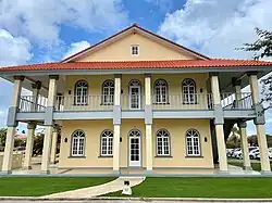 The former headquarters' architecture incorporates elements from the building styles used in the former Dutch East Indies, including encompassing covered verandas and expansive roof overhangs. Additionally, the construction displays features reminiscent of English architectural styles found in the Leeward Islands and the southern United States.