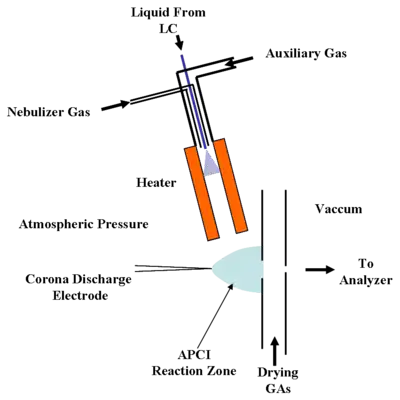 Ionization in the gas phase by APCI follows the sequences: sample in solution, sample vapor, and sample ions. The effluent from the HPLC is evaporated completely. The mixture of solvent and sample vapor is then ionized by ion-molecule reaction.[9]