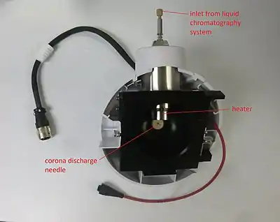 A typical APCI source usually consists of three main parts: a sample inlet, a corona discharge needle, and an ion transfer region under intermediate pressure.[5] In the case of the heated nebulizer inlet[7] from an LC, as shown in the figure, the eluate flows at 0.2 to 2.0 mL/min into a pneumatic nebulizer which creates a mist of fine droplets. Droplets are vaporized by impact with the heated walls at 350–500 °C and carried by the nebulizer gas and an auxiliary gas into the ion molecule reaction region between the corona electrode and the exit counter-electrode.[4] A constant current of 2–5 microamps is maintained from the corona needle. Sample ions are produced by ion-molecule reactions (as described below), and pass through a small orifice or tube into the ion transfer region leading to the mass spectrometer.