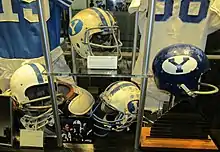 Historical BYU helmets on display at the Legacy Hall