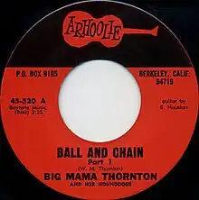 In 1968, Arhoolie Records released "Ball and Chain".[5] An edited version, titled "Ball and Chain Part 1" was released as a single, while the complete four and a half minute song is included on a joint album by Thornton, Lightnin' Hopkins, and Larry Williams titled Ball and Chain.[6] Thornton is backed by a small combo with her frequent guitar accompanist Edward "Bee" Houston.[7] She later recorded several live and studio performances of the song, included her 1969 Billboard Top 200 album Stronger Than Dirt.[8]