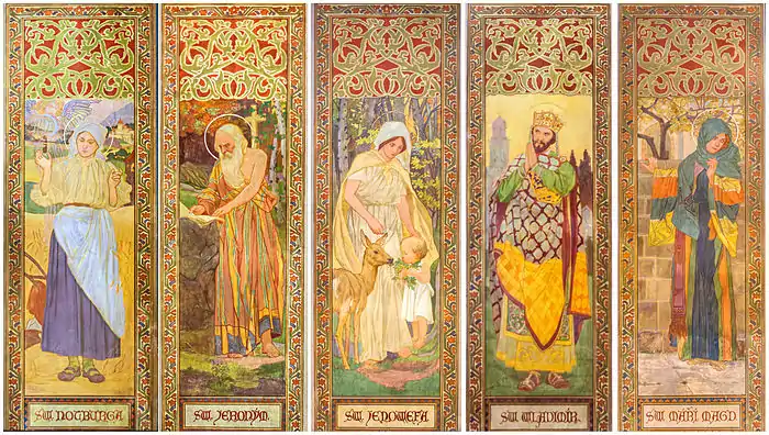 Seemingly every inch of the walls, pillars and ceilings is covered with the ornate, flowing decoration of the painter František Urban and his wife Marie Urbanová-Zahradnická inspired by Alfons Mucha. Nameless winged women flank the archways from the nave and fill the vault sections of the arcades. Up the pillars and along every picture's border run floral patterns and colourful ribbons. The vivid greens and browns which cover the entirety of the interior create a feeling of being inside a forest. The ceiling of the nave is dark green, as if it is a canopy in shadow. Even the brown wooden benches on the ground for the beholders of church services are ornately carved with oak leaves.[2]