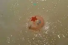 A bath bomb or bath fizzie is a consumer product used during bathing. It was invented and patented in 1989 by Mo Constantine, co-founder of Lush Cosmetics.[1] It is a compacted mixture of wet and dry ingredients molded into any of several shapes and then dried. Bath water effervesces at the surface of a bath bomb immersed within it, with attendant dispersion of such ingredients as essential oil, moisturizer, scent, or colorant.