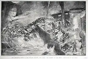 Two flotilla leaders of the Royal Navy — HMS Broke and Swift — were on patrol near Dover and engaged six of the German ships early on 21 April near the Goodwin Sands.[3] In a confusing action, Swift torpedoed SMS G85. Broke rammed SMS G42, and the two ships became locked together. For a while, there was close-quarters fighting between the crews, as the German sailors tried to board the British ship,[1] before Broke got free and G42 sank.[4]