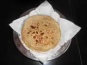 Bihari cuisine include litti chokha,[2] a baked salted wheat-flour cake filled with sattu (baked chickpea flour) and some special spices, which is served with baigan bharta,[3] made of roasted eggplant (brinjal) and tomatoes.[4][5] Dairy products are consumed frequently throughout the year, including dahi (yogurt), spiced buttermilk (known as mattha), ghee, lassi and butter.