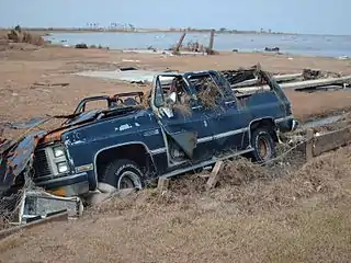 Hurricane Ike caused cataclysmic destruction of the peninsula, reducing the region to rubble and causing severe, permanent change in the shoreline. Entire communities along the upper Texas coast were simply wiped out by Ike's catastrophic storm surge.[26] Ike's effects were disproportionally felt near the long, low-lying Bolivar Peninsula which has typical elevations around 2 m. Despite being only a strong category 2 storm with maximum winds at landfall of 95 knots (49 m/s, Berg, 2009), Ike's extremely large, long-lasting surge and waves devastated the peninsula.[25] In Gilchrist, Texas, NOAA aerial photography reveals complete destruction. The Rollover Pass bridge was reduced to one lane. Of the 1,000 buildings in Gilchrist, 99.5% of them were knocked off of their foundations. Of the buildings off of the foundations, the storm demolished some and washed others onto swamplands behind Gilchrist.[27]
