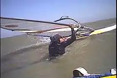 When a sailor falls and must recover to a sailing position, the boom is sometimes used in one of the initial steps of performing a waterstart. When the sail is first lifted from the water, it often helps to push the back of the board slightly underwater, and then setting the front of the boom onto the board (near the footstraps). The buoyancy of the board will then push the boom upward, helping to lift the sail out of the water.[1][2][3][4][5]