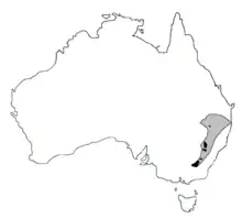 The Booroolong frog was distributed along eastern Australia, ranging from the Queensland border to the Victorian Border.[4] This species was once abundant in streams above about 200 m (660 ft), until drastic declines began to occur in the mid-1980s in the Northern Tablelands in northern New South Wales. A dramatic population reduction in the mid-1980s and 1990s made it so only a limited amount of the prior distribution range was occupied. Now, at the majority of the remaining sites, there is only a low population of the species present. Although some declines have occurred in the Central Tablelands and Southern Tablelands of New South Wales, they have not been so severe. As of 2021 in the Northern Tablelands, the Booroolong frog has disappeared almost entirely from high elevation streams and is only found in two streams near Tamworth, as well as near Glen Innes in a private dam, with this total area covering only 10 km2 (3.9 sq mi).[5][4] In the Central Tablelands, it is found along the Abercrombie River and Turon River catchment areas. In the southern tablelands, this species is still found along the Tumut River, Yarrangobilly River, and the upper Murray River catchment areas. It was still present at one stream in Victoria in 2021. Each subpopulation, of which there are 28 spanning three regions (Northern, Central, and Southern Tablelands), is forced into isolation from other subpopulations by great areas of unsuitable habitat.[5]