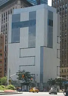 Also in 2002, Cloepfil won the redesign of Edward Durell Stone's 2 Columbus Circle[11] for the Museum of Arts and Design over architects Zaha Hadid, Toshiko Mori Architects, and Smith-Miller & Hawkinson Architects. Interest in landmarking this building began in 1996, soon after the building turned thirty years old and became eligible for landmark designation. In this year, Robert A. M. Stern included it in his article "A Preservationist's List of 35 Modern Landmarks-in-Waiting" written for The New York Times.[12]