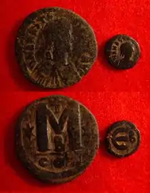 The start of what is viewed as Byzantine currency by numismatics began with the monetary reform of Anastasius in 498, who reformed the late Roman Empire coinage system which consisted of the gold solidus and the bronze nummi. The nummus was an extremely small bronze coin, at about 8–10 mm, weight of 0.56 g making it at 576 to the Roman pound[3] which was inconvenient because a large number of them were required even for small transactions.