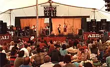 Most artists perform more than once over the weekend on the different stages: Stage 1, within a large marquee in front of the main Festival arena; Stage 2, a smaller marquee; a Floor Singers stage at the Coldham's Common camp site; and the Club Tent, hosted on the Festival's behalf by five local folk clubs. There, in addition to invited artists, members of the audience including some well-known names get up and perform. There is a small tent called The Hub where young people can practise together or attend workshop sessions.[6] In addition, there is a small marquee in the Flower Garden, which hosts workshops which vary from year to year. Regular fixtures have been the storytelling workshop and, since 2011, the Northumbrian small piping workshops, where festival-goers can try their hand on practice sets of pipes. [7] Elsewhere around the site, local musicians are invited by the festival to provide informal sessions, a regular favourite being the Irish sessions.