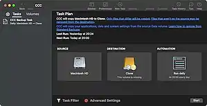 CCC's main window lets users select a source disk and a destination disk, and optionally deselect source files or folders from being copied. It supports backup scheduling.[2][4][5]