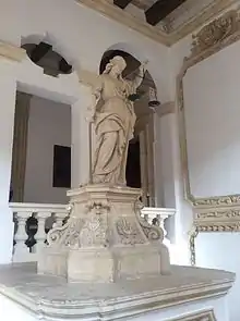 Local hard limestone was used for construction, however the main portico was decorated with Carrara marble.[134] Some of the marble used was cannibalized from the ruins of the Temple of Proserpina, an ancient Roman temple in Mtarfa which had been discovered in 1613.[lower-alpha 2] A craftsman who worked on the decorative sculpture of the Castellania's façade's central-piece[140] and chapel was Maestro Giovanni Vito,[141][142] the Puglisi (from Pùglia), a Neapolitan buonavoglia (a rower on the galleys[143][144]).[109][115] He would become the first man to be convicted of murder and sentenced to death by hanging in the new Castellania on 15 December 1760.[145][146] With the remodelling of the edifice, Pinto has ubiquitously besprinkled[147] his heraldic symbolic couchant crescents,[148] in the interior and exterior of the architecture of the building, to convey a message of his absolutism and opulence.[148][149] Sometimes after its completion, artist Tiepolo Favray took record of the notorious building.[150] Disseminated information among European monarchies compared it to be of proportionate to the expectations of the most powerful nations.[151]