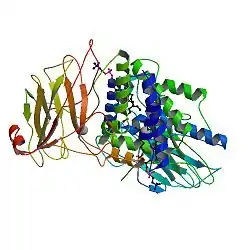 Each catalytic domain is composed of two stacked, mixed topology β sheets and several random coils. These sheets and coils subsequently encompass the active site: a non-heme iron(III) complex. Without heme, iron must be ligated to four amino acid residues (Tyr200, His226, Tyr164, His224) to maintain is catalytically active conformation. With Tyr200 and His226 acting as the axial ligands and Tyr164, His224, and a solvent water molecule acting as equatorial ligands, the Fe3+ complex displays trigonal bipyramidal geometry. Since the active sites of each catalytic domain are separated by a distance of 40 Å, they are not believed to allosterically effect one another.