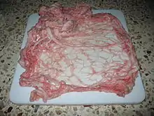 Caul fat, also known as lace fat, omentum, crépine or fat netting, is the thin membrane which surrounds the internal organs of some animals, such as cows, sheep, and pigs, also known as the greater omentum. It is used as a casing for sausages, roulades, pâtés, and various other meat dishes.[1] Examples of such dishes are Swiss atriau,[2] French crépinette,[3] Cypriot sheftalia, South African skilpadjies, British faggots,[1] Serbian plućna maramica and trbušna maramica and Italian fegatelli. In the traditional Ukrainian and Russian cuisine, caul fat, known as salnik or salnyk, was usually filled with kasha and liver, and baked in a clay pot in the Russian oven.[4] The Navajo people of the Southwestern United States wrap sheep intestines around strips of caul fat to make a dish called ach'ii'.