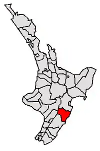 Central Hawke's Bay District is in the Hawke's Bay Region in the North Island of New Zealand. Formed in 1989, it covers an area of 3,333 square kilometres, from Pukehou in the north to Takapau in the south, and from the western Ruahine Range to the Pacific coast in the east. It has a population of 16,000 (June 2023),[2] up from 14,142 in the 2018 census and 12,717 in the 2013 census.[3]