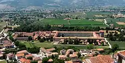 Padula Charterhouse was founded by Tommaso di San Severino on 27 April 1306 on the site of an earlier monastery. It is dedicated to Saint Lawrence, and its architectural structure supposedly recalls the griddle-iron upon which the saint was burnt alive.