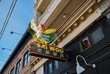 In 2017, a neon sign featuring a large green and yellow-coloured rooster for the Sai Woo Restaurant was installed on Pender Street. The new owner of the Sai Woo was made aware of the original sign that hung outside the earlier incarnation of the restaurant (1925–59) from a one-second clip from a movie of a 1958 parade in Chinatown, and launched a search for the original sign which was unsuccessful.[53] The sign was recreated from the archived footage.[54] At the same time, plans were announced to relight the tall Ho Ho sign in 2018 or 2019.[55][56]