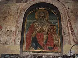 An icon of Saint Athanasius in the patron niche in the western facade of the church.