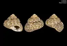 A variety is olivaceous green, maculate with white, the apex rosy. It is a small species, with very prominent, compressed basal tooth, and slight crenulations at the margin of the umbilicus, the right lip not dentate.[2]