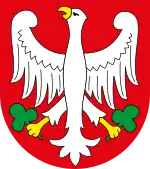 The coat of arms of Gorzów Wielkopolski in Lubusz Voivodeship, Poland consists of the red eagle holding green clover flowers in each of its legs, placed in the white escutcheon.
