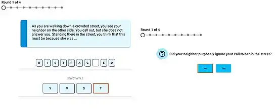 An example of a cognitive bias modification for interpretation (CBM–I) paradigm utilized in MindTrails, an online program developed by anxiety researchers at the University of Virginia. The program displays a cognitive task that disambiguates a scenario to be either positively or negatively valenced (correct responses highlighted in orange).