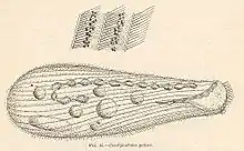 Condylostoma are very large elongated unicellular ciliates with lengths ranging from 176 to 1600 µm.[4][5] They also tend to be about 7 times longer than their width.[4][6] While the shape of the cell can vary depending on many factors, especially the amount and size of food vacuoles present, they are normally more rounded towards the middle of the cell and have a blunt posterior end. The relatively small buccal groove is about ⅓ the size of total body length and is present ventrally on the anterior part of the cell. The buccal groove is triangular. While there are no cilia inside the groove the surrounding “lips” are covered in cilia. Early papers describe a thin transparent undulating membrane around the buccal groove which is now known to be the adoral zone of membranes (AZM). These membranes can be composed of 70 to 200 polykinetids.[7] They have a very elastic thin pellicula (membrane) surrounding the cell which can be 2 to 8µm depending on the section. The cells are covered in longitudinal myonemes, which help make them contractile, and have trichocysts present in the posterior end of the cells. Being ciliates they are covered in cilia except in the buccal funnel.[4] The cilia are oriented following the myonemes in rows. While the number of kinetosomes do not change during interphase, the length of the kineties do, to accommodate for the cell's change in size.[7] Their cilia are long and slender, with the posterior cilia being the longest. Additionally, some research states that the ventral side of the cell has fewer, longer cilia than the dorsal end but this has been disputed.[1][4] Additionally many species were found to have at least one frontal cirrus with some having up to four present.[8] Looking at the interior of the cell, they are full of food vacuoles as well as cortical granules. They have a macronucleus with differing numbers of nodules ranging from 6 to 120.[1][4] The pellicle of the cells is rough and dark grey, with randomly dispersed granules directly below it. The cell itself is almost colorless but has a slightly grey or yellow tinge to it.[3] No contractile vacuole was observed at least in the marine species. The cells in this genus are notoriously hard to identify for two main reasons. First, there are many morphological differences between the species in this genus making it hard to identify them as belonging to the Condylostoma genus. Second, the species that have been described do not have as much detail as would be needed given the fact that there are few character states, otherwise known as traits, that can be used to identify cells as belonging to this genus.[4]