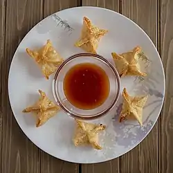 The appetizers are cooked to crispness by deep-frying in vegetable oil or by baking.[3][4][5] They can be served hot or cold.[3][5] In North America, Crab Rangoon is often served with a sauce for dipping such as soy sauce,[6][10] plum sauce,[11] duck sauce,[10][12] sweet and sour sauce,[1][4][7][10] or a hot mustard sauce.[8][13]