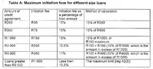The maximum initiation fee in terms of the Regulations is R165 per credit agreement, plus ten per cent of the amount of the agreement in excess of R1,000, but never to exceed R1,050. Also, the initiation fee may never exceed fifteen per cent of the principal debt.[6]