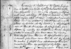 The collection of manuscripts Smith and his scribes produced is now known as the Kirtland Egyptian papers.[22][23] One of the manuscripts in this collection was a bound book simply titled "Grammar & A[l]phabet of the Egyptian Language" (GAEL), which contained Smith's interpretations of the Egyptian glyphs.[24][23] This manuscript details Smith's belief that hieroglyphics had five "degrees" of interpretation, with each "degree" representing a deeper, expanded, and more complex level of interpretation.[25] This manuscript illustrates Smith's method for translating the papyri: The scribes sketched out the hieroglyphic characters from the papyri onto the left-hand side of the manuscript. Smith then gave his English translation of the glyph, along with an explanation for how one would pronounce the character.[25]