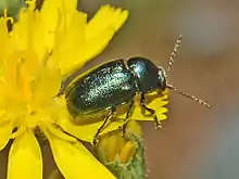 Cryptocephalus virens is a cylindrical leaf beetle belonging to the family Chrysomelidae, subfamily Cryptocephalinae. The species was first described by Christian Wilhelm Ludwig Eduard Suffrian in 1847.