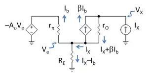 An idealized treatment of output resistance is given in the footnote.[nb 2] A small-signal analysis for an op amp with finite gain Av but otherwise ideal is based upon Figure 5 (β, rO and rπ refer to Q2). To arrive at Figure 5, notice that the positive input of the op amp in Figure 3 is at AC ground, so the voltage input to the op amp is simply the AC emitter voltage Ve applied to its negative input, resulting in a voltage output of −Av Ve. Using Ohm's law across the input resistance rπ determines the small-signal base current Ib as: