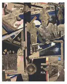 The collage is a sectional view of the period after World War I. It is possible to recognize faces of German President Friedrich Ebert in a swimsuit and US President Woodrow Wilson as an angel of peace. There is ridicule, changing perspectives and proportions, and between them words and letters. Höch is the only female Berlin Dadaist who used photomontage to parody "giant global absurdities" using photos, headlines and advertisements from magazines.[1]