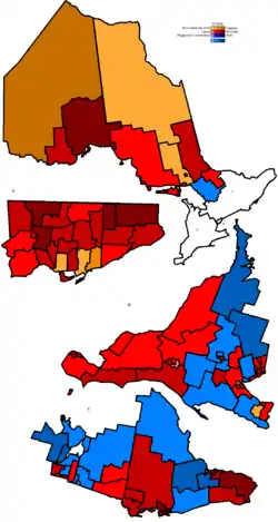 McGuinty's Liberal's 2003 sweep of the province. Liberal seats won appear in shades of red.