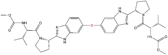 5. 1 2 3 Lemm, J. A.; Leet, J. E.; O'Boyle, D. R.; Romine, J. L.; Huang, X. S.; Schroeder, D. R.; Alberts, J.; Cantone, J. L.; Sun, J.-H.; Nower, P. T.; Martin, S. W.; Serrano-Wu, M. H.; Meanwell, N. A.; Snyder, L. B.; Gao, M. (16 May 2011). "Discovery of Potent Hepatitis C Virus NS5A Inhibitors with Dimeric Structures". Antimicrobial Agents and Chemotherapy. 55 (8): 3795–3802. doi:10.1128/AAC.00146-11. PMC 3147613. PMID 21576451.