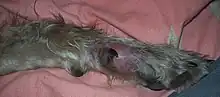 Grapes and raisins can cause acute kidney failure in dogs[40] The exact mechanism is unknown, nor is there any means to determine the susceptibility of an individual dog. While as little as one raisin can be toxic to a susceptible 10 pounds (4.5 kg) dog, some other dogs have eaten as much as a pound of grapes or raisins at a time without ill effects. The affected dog usually vomits a few hours after consumption and begins showing signs of kidney failure three to five days later. A mycotoxin is suspected to be involved, but one has not been found in grapes or raisins ingested by affected dogs. Salicylate, tartaric acid, or potassium bitartrate have also been implicated. The reason some dogs develop kidney failure following ingestion of grapes and raisins is not known.[41][42][43][44] The most common pathological finding is proximal renal tubular necrosis.[45]
