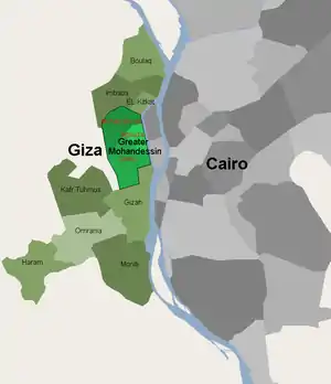 These developments and hamlets made up most of the Wasat (middle) district in the city of Giza,[4] before being divided in 1997 into the districts of Dokki (developments, hamlets and southern half of Madinat al-Awqaf, refletced in the names of the sub-districts, see Demographics below), and Agouza to the north with the northen half of Madinat al-Awqaf known colloquially today as Mohandessin.